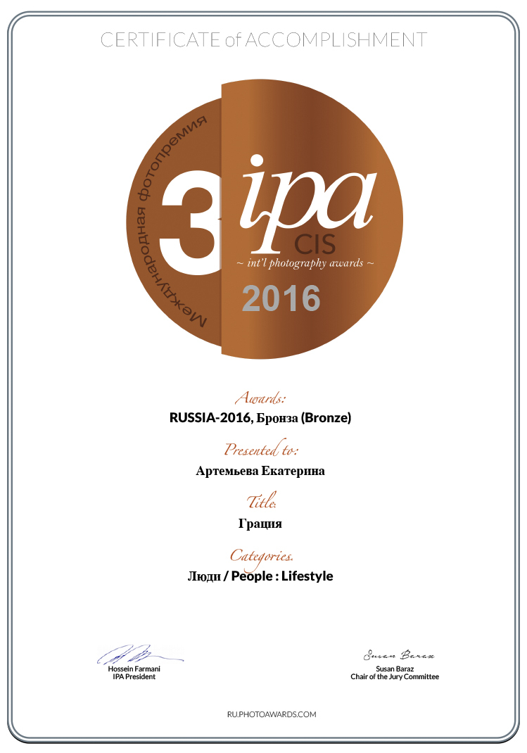 IPA CIS 2016 International Photography Awards, Лос-Анджелес, 3-я премия в категории Люди/образ