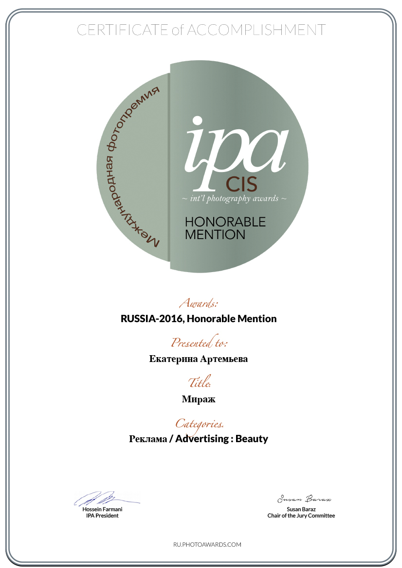 2016 MIFA, Moscow International Foto Awards, 3-я премия в категории реклама / красота.