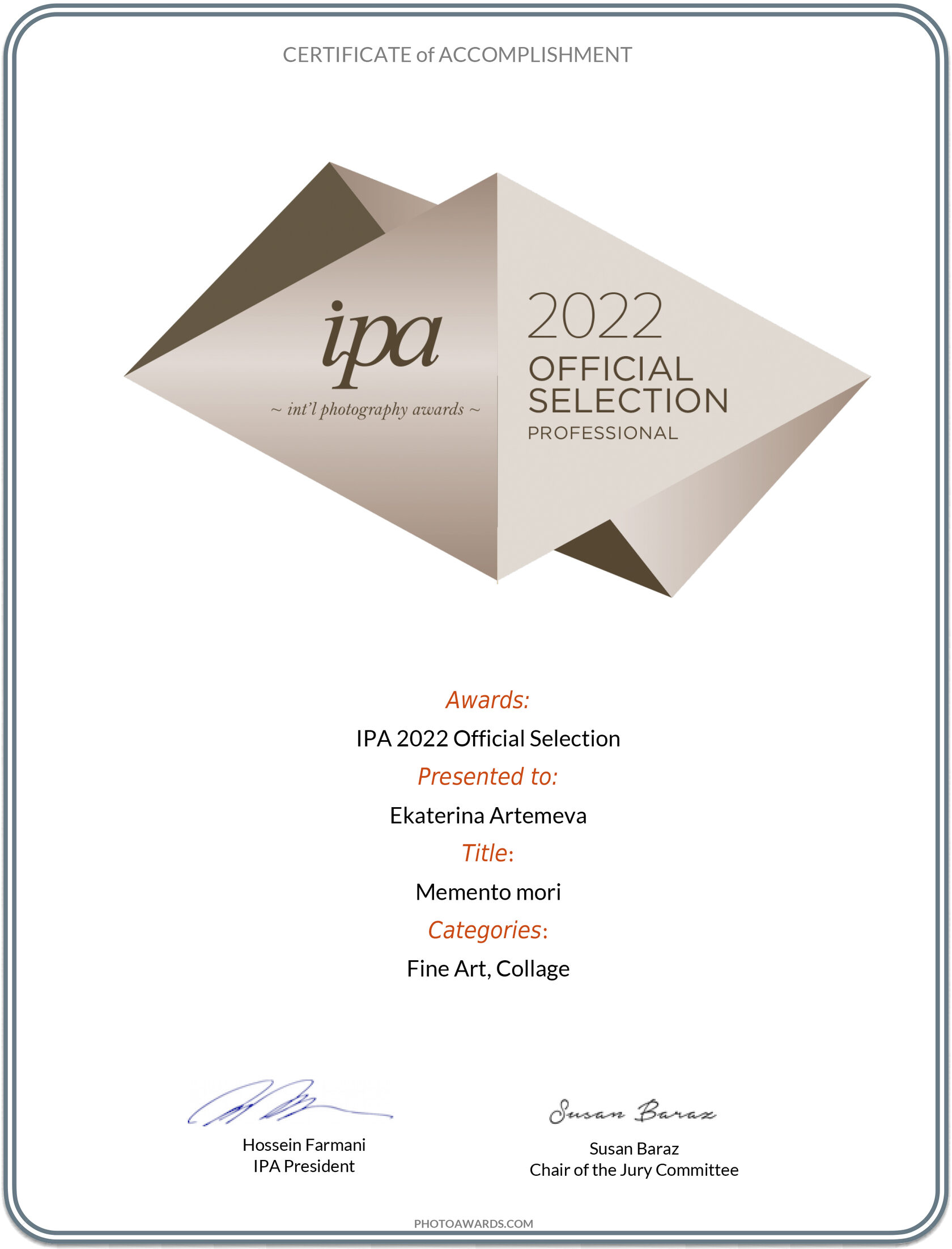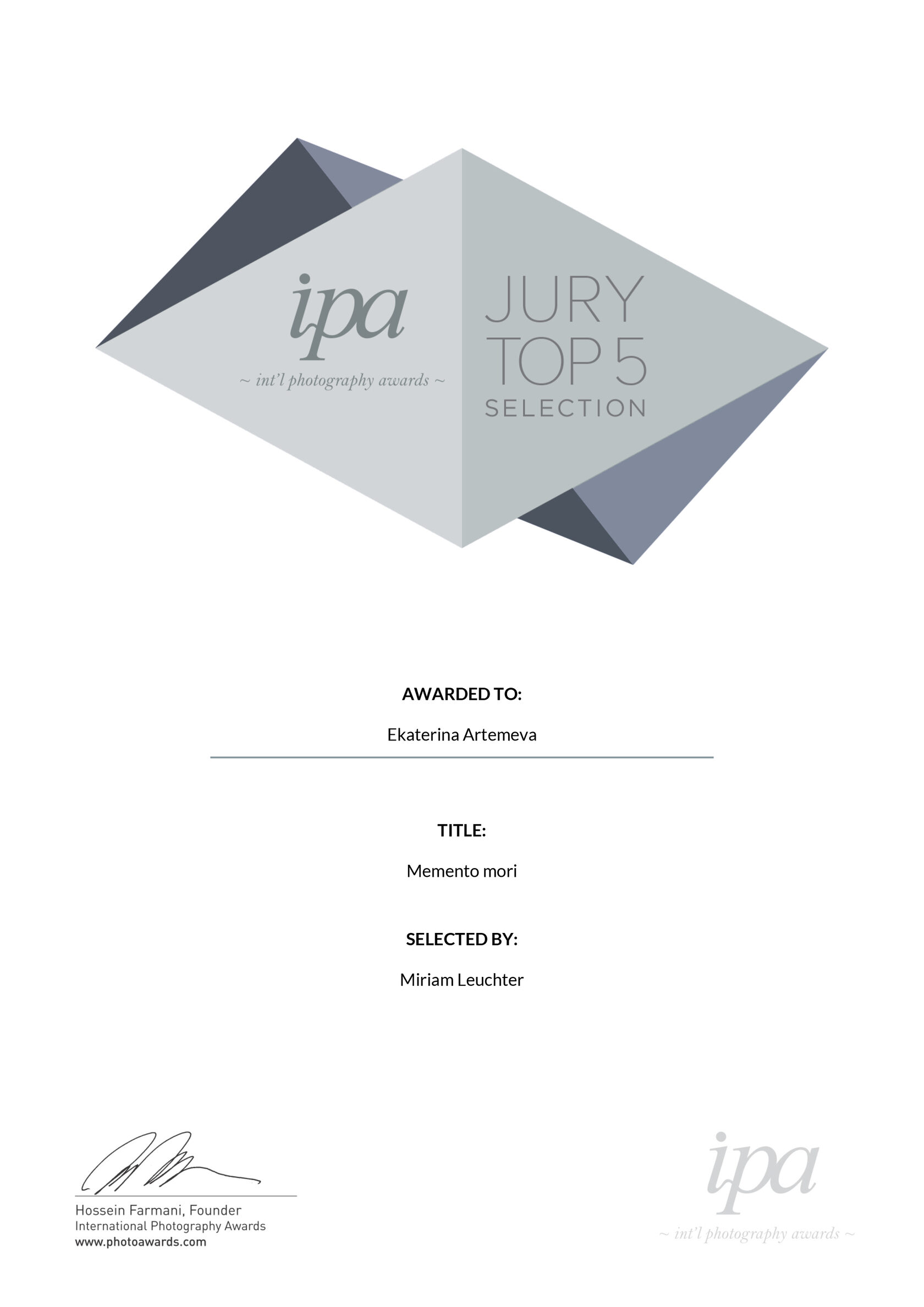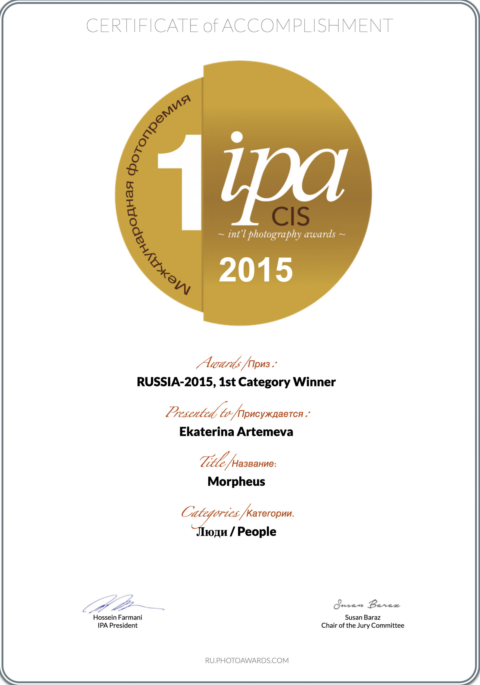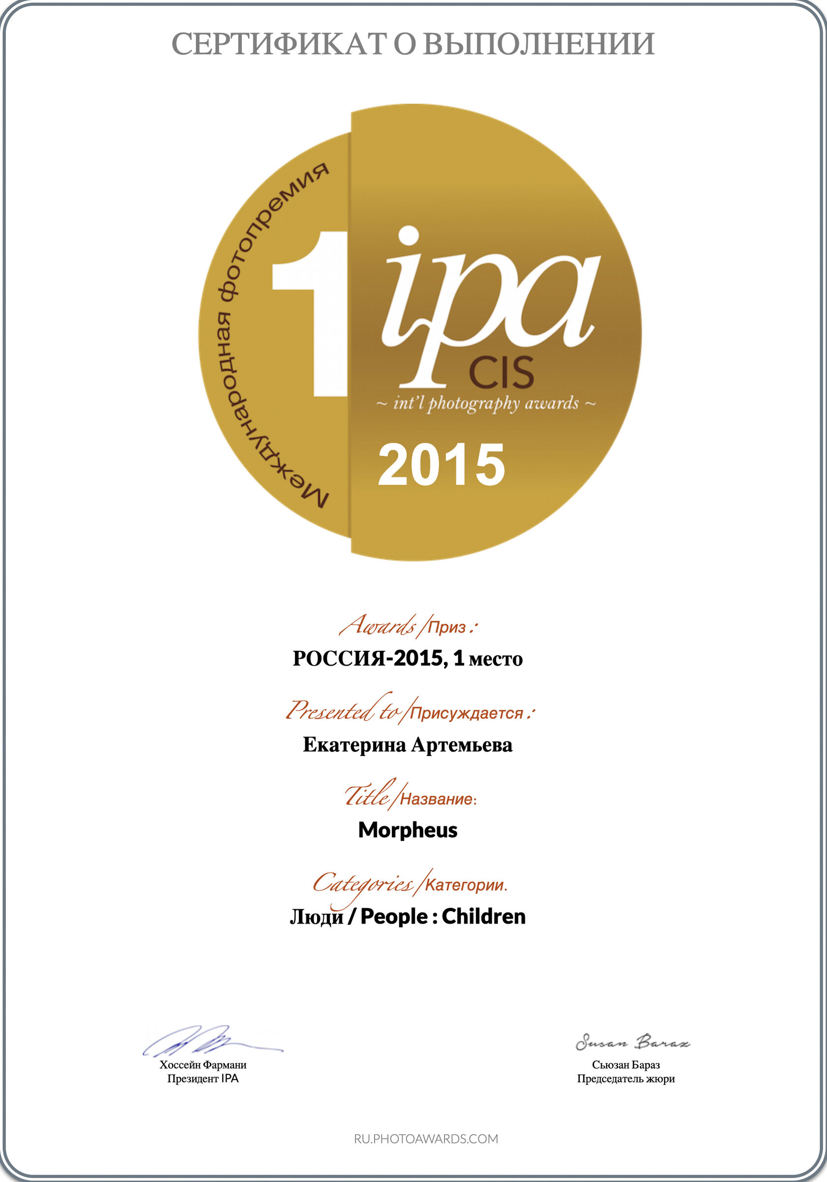 2015IPA, International Photography Awards, Лос-Анджелес, 1-я премия в двух категориях