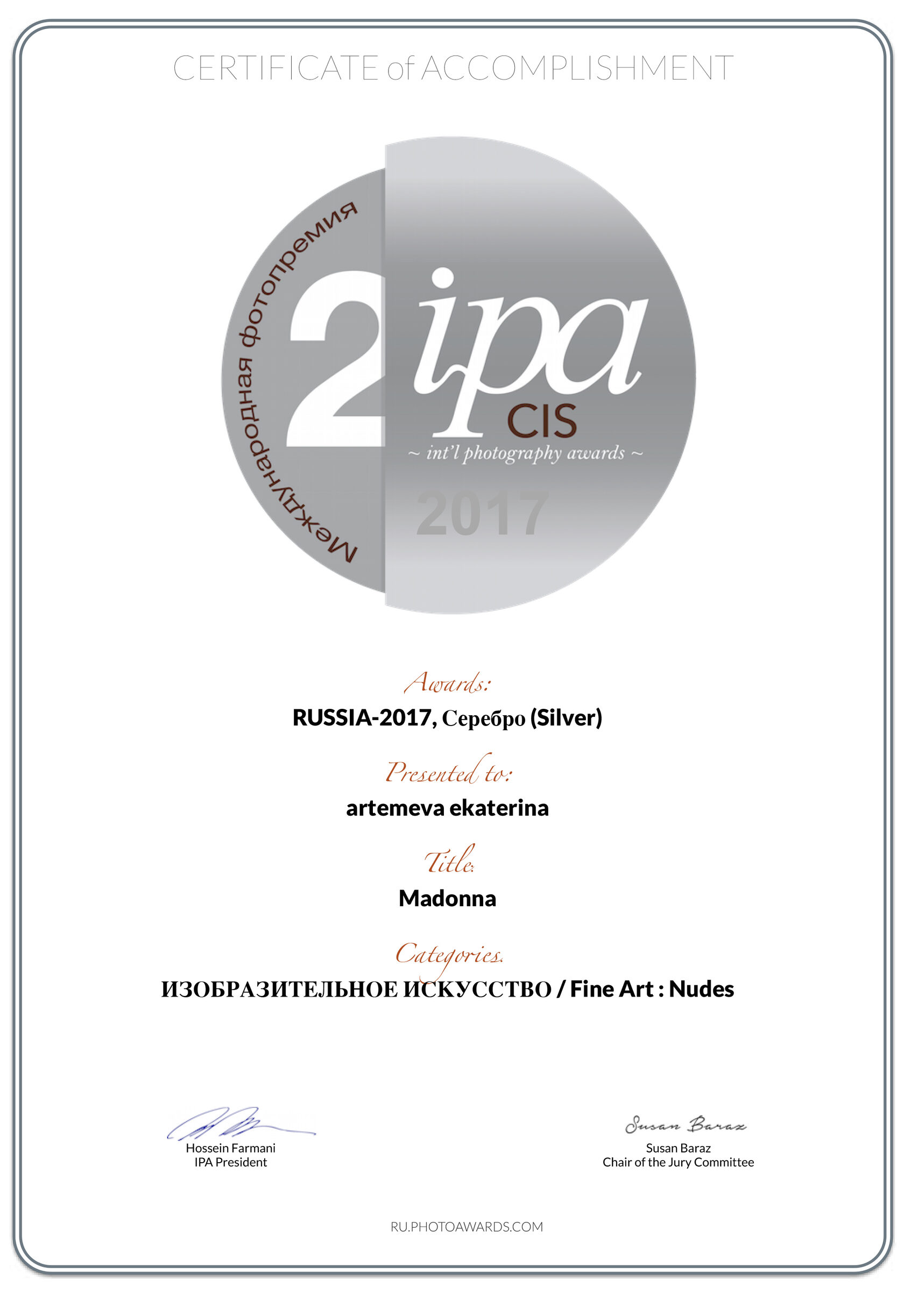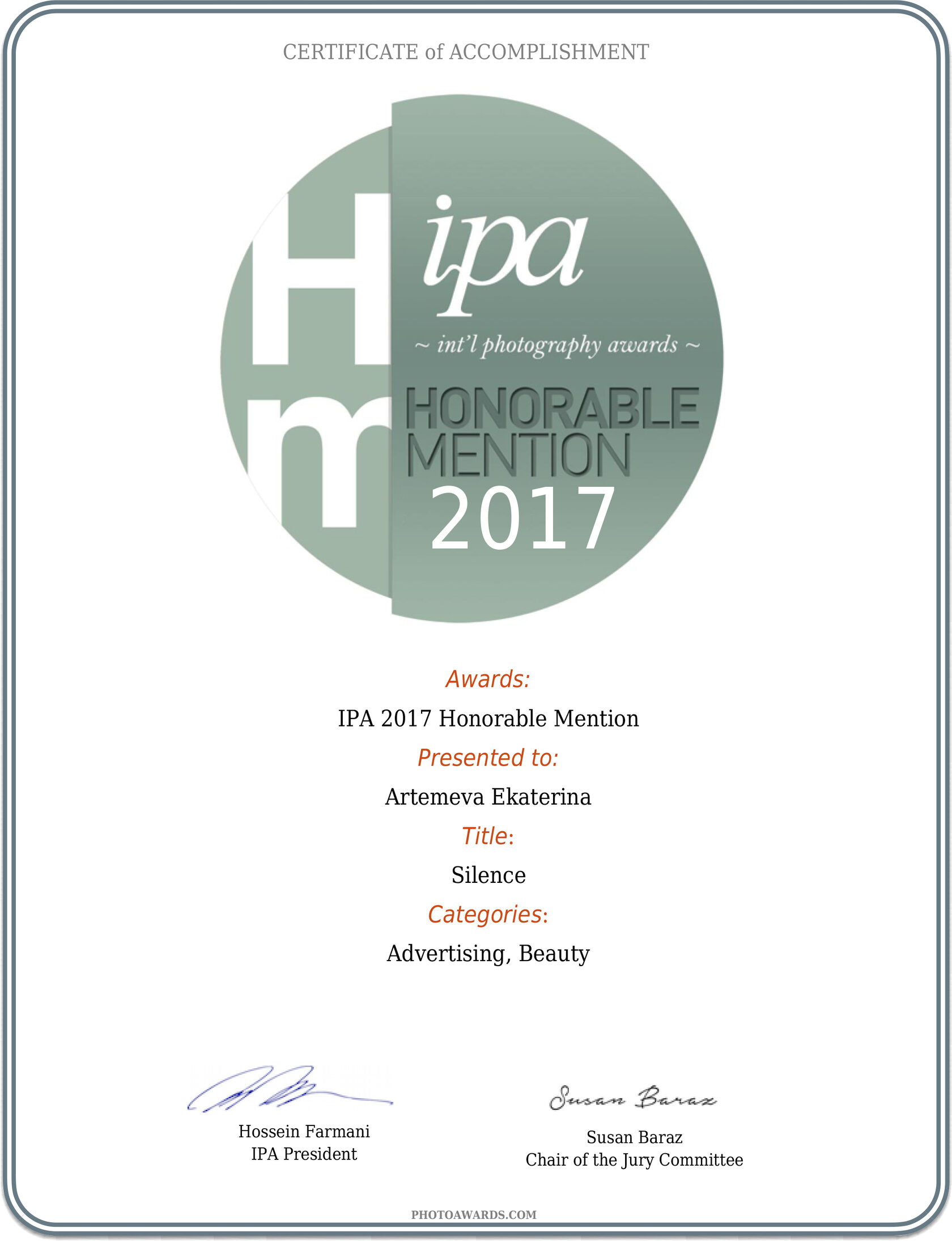 2017 IPA CIS 2017 International Photography Awards, Лос-Анджелес, 2-я премия в категории Изобразительное искусство / НЮ.