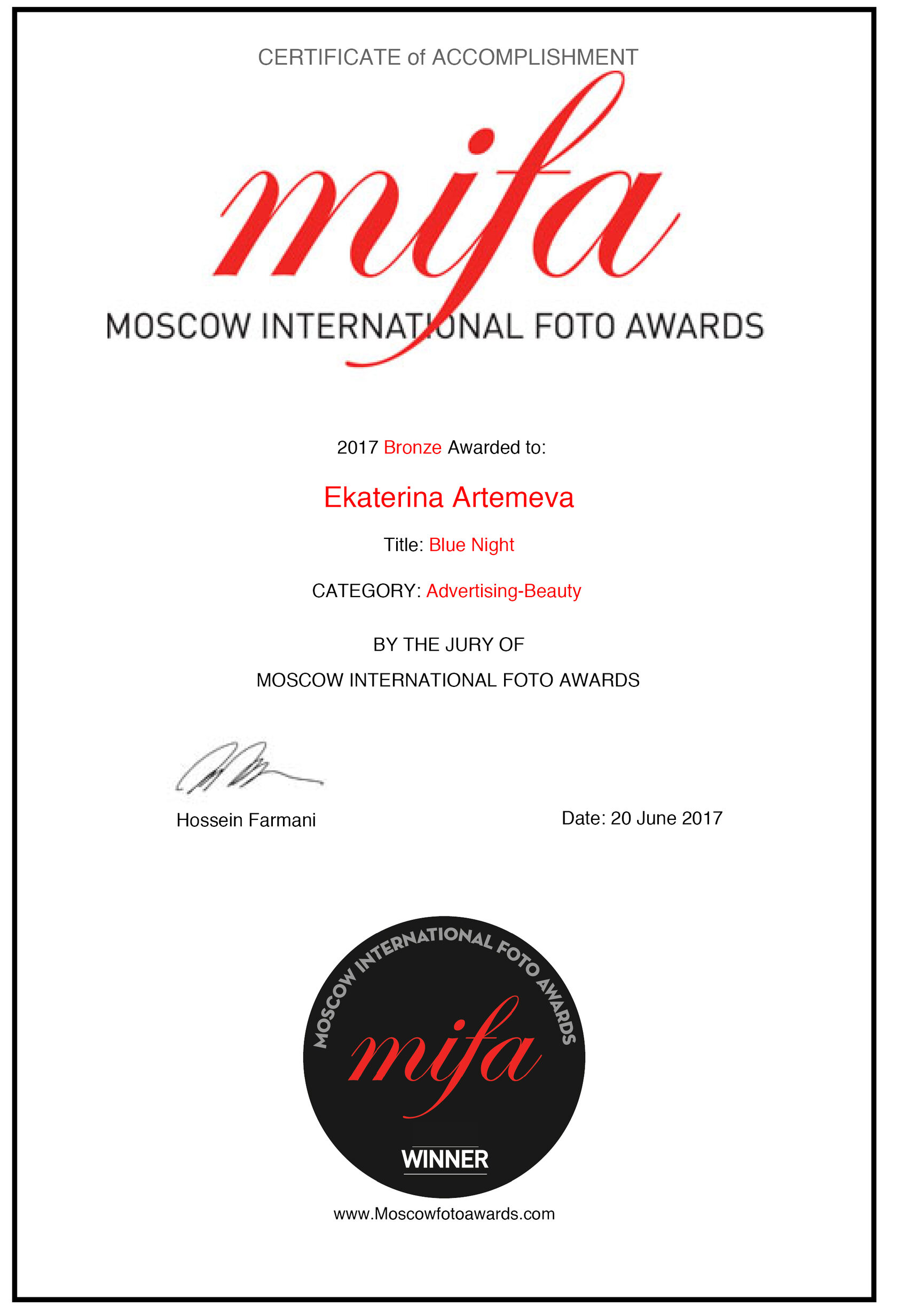 2017 Mifa, Moscow International Foto Awards, 3-я премия в категории реклама / красота.